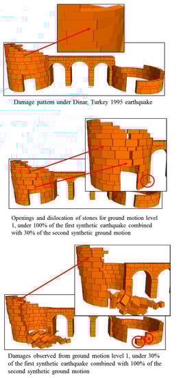 In the following runs, for each ground motion level the numerical model subjected to synthetic earthquakes in two horizontal directions with a duration of 11 s. A total of four dynamic analyses were performed under synthetic loading combination. According to the results obtained from ground motion level 1, under 30% of the first synthetic earthquake combined with 100% of the second synthetic ground motion, the highest round tower collapsed, while the three masonry gate arches were able to sustain such a large action (PGA about 1g). Representative responses of this analysis in terms of the contour diagram of final displacement magnitude are depicted in Figure 12. For the second combination as 100% of the first synthetic earthquake combined with 30% of the second synthetic ground motion, some small blocks fell and the highest round tower was very close to collapse, a result consistent with the previous run. For ground motion level 2, a lower level of seismic input, under the first case as 100% of the first synthetic earthquake combined with 30% of the second synthetic ground motion, the maximum displacement was 0.16 m (Figure 13), whereas under the second combination the tower experienced maximum displacement of 0.13 m. Again, the top of the higher tower showed more displacements, but no collapse was observed for this lower seismic level. In addition to the displacements, the normal and shear stresses observed from dynamic analyses were evaluated. Considering the stresses, a much better seismic response was observed under the Dinar earthquake than for the synthetic seismic excitations. Figure 14 shows some damage patterns as openings and dislocation of stones under the Dinar, Turkey 1995 earthquake and the synthetic earthquakes. The results predicted by the model for the Dinar earthquake are compatible with the available data which indicate that no major damage was detected in the structure after this seismic event. It can be concluded that when the numerical model is subjected to real or synthetic seismic excitations, the main damage was observed in the higher elevations of the round towers, around the door openings, and also extending to the arch intrados. These results show that the expected forms of structural damage to this gate due to seismic excitations are sliding, dislocation and falling of stones mostly along the towers when the horizontal inertial forces exceeded certain limits. Under both combination of synthetic earthquake for ground motion level 1, the highest tensile stresses were observed along the round tower, which would have resulted in a flexural failure mechanism. As shown in representative figures (Figure 14), openings and dislocation of stones took place due to the sliding on horizontal bed joints, which are associated with shear behavior. It is seen that the observed openings have a pattern which would cause typical diagonal cracking.