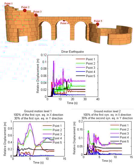 Under real and synthetic earthquakes, time histories of displacements relative to the base of the model were evaluated at five points, shown in Figure 15. It is obvious from these that under the Dinar earthquake and the synthetic motions, the round towers and the gate show quite different movements, with the arched gate displaying lower values. The maximum values of displacements relative to the model base during dynamic analyses for real and synthetic earthquakes for the five points shown in Figure 15 are given in Table 3. We can see that point 4, located at the masonry arch, experienced relatively lower displacements under real and synthetic loadings. Although point 1 is at the highest point, in some runs, the maximum displacement occurred at point 3 (near the gate-tower junction) under the real earthquake and three of four synthetic loadings, showing that this area is subject to intense motion.