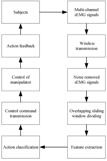 Schematic diagram of the proposed sEMG detection and action recognition system. Raw multi-channel sEMG signals were first acquired and transmitted wirelessly to the host computer. Then the signals were filtered and divided into sliding windows. In each window, feature extraction and action classification were conducted. The output label of the classifier drove the manipulator via the corresponding control command. The action consistency of the subject and the manipulator was observed in real time.