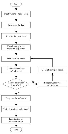 Support Vector Machine (SVM) is specially applied to process data with limited samples, based on structural risk minimization. The penalty coefficient and kernel parameter are the key factors that affect the learning and generalization ability. The penalty coefficient acts on the ratio of empirical risk and confidence range in a given feature subspace. The kernel parameter affects the complexity of the same type of data in high-dimensional space. In parameter optimization, it is usually difficult to choose the best parameter through empirical or manual calculation, so grid division and Genetic Algorithm (GA) are commonly applied to realize the simultaneous optimization of the training parameters [39,40].