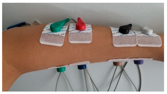 A group of subjects (mean ± SD: 25 ± 3.9) were recruited. We comprehensively considered their ages, weights, genders, and physical health to ensure the validity of the experiment. The subjects were 19 healthy volunteers, including 11 males and 8 females. The left arm was selected for acquiring sEMG signals. Before enlisting, volunteers should have met the requirement of no muscle disease. We told them to follow the operator’s reminder to force or relax the muscles when doing the experiment in advance. Before acquisition, the subjects were first instructed to relieve stress to ensure that the muscles were not fatigued. Then, the surface of the skin was cleaned to remove excess cuticle and lower the impedance. Later, conductive adhesive was smeared on the electrode to strengthen the conductivity. Eventually, the electrodes were fixed. The electrode positions are shown in Figure 4. Nine electrodes were requested so that our device applied four-channel differential input and the elbow was opted as the reference, in the meantime. The sEMG signals were acquired from extensor pollicis longus, finger extensor muscle, and palm long extensor muscle. The elbow had less muscle and would not be affected by other muscles.