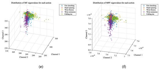Spatial distribution of each feature. (a) MAV, (b) ZC, (c) WL, (d) RMS, (e) MF, and (f) MPF. The x, y, and z labels are channel 1, 2, and 3. The actions represented by different colors are marked—the blue points represent fist clenching, the red points represent hand opening, the yellow points represent wrist flexion, the purple points represents wrist extension, and the green points represents calling me. The classification effect is better if the difference can be seen with the naked eye. Or if it is difficult to distinguish the scattered points, the classification effect is poor.