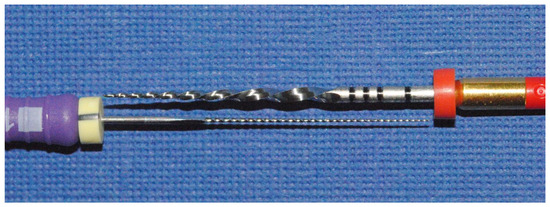 Electronic apex locators are precise and reliable in more than 90% of cases [4,5]. They are ergonomically advantageous, as they allow the WL to be checked several times during the clinical procedures without increasing the overall treatment time [6]. WL should be checked three times during treatment: first after the initial canal scouting with manual K-files (KF), then after glide path and immediately after root canal coronal enlargement, because WL changes are expected due to straightening of the canal curvatures (CC) [7,8,9]. Therefore, WL transfer between the KF and the subsequent mechanical shaping instruments should be extremely precise in order to equally prevent over- and under-instrumentation. Over-instrumentation with nickel–titanium (NiTi) rotary or reciprocating files of augmented taper may have clinical implications, including apical transportation [10] and overfilling [11] with defective apical seal control, especially in curved canals, and greater incidence of post-operative pain [12,13]. On the other hand, under-instrumentation may predispose the creation of blocks and ledges, which can negatively influence the long-term prognosis of the endodontic treatment, leaving a residual bacterial load inside the root canal [3]. Therefore, during the clinical practice, WL is usually checked electronically and radiographically with a manual K-File (KF) and determined by the position of a rubber stop at the coronal reference point. Afterwards, the WL is measured with a manual endodontic gauge and transferred to the NiTi mechanical instrument selected for shaping [5,6]. A careful WL transfer procedure is required to ensure measurement reliability [14], but this clinical procedure may be prone to errors. The objective of this study was to evaluate the accuracy of two different clinical methods of transferring WL between endodontic instruments. This aspect could be crucial for the optimization of clinical practice and for improvements in treatment outcomes. The null hypothesis is that both methods are comparable in transferring WL measurements.