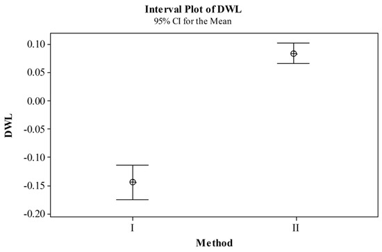 The difference between methods I and II for transferring WL was found to be statistically significant (df = 1; F = 71.52; p < 0.001). Figure 2 shows that method I tended to underestimate reported WL, leading to a mean error of 0.20 mm. On the contrary, method II overestimated WL by approximately 0.09 mm. Therefore, the DWL absolute values obtained with method II were found to be closer to 0 mm (i.e., the same length as the corresponding KF) than those obtained with method I.