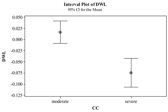 The parameters CL (df = 2; F = 1.27; p = 0.300>0.05), CC (df = 1; F = 2.22; p = 0.149 > 0.05) and the interactions involving them (method*CC (df = 1; F = 4.06; p = 0.055 > 0.05); method*CL (df = 2; F = 2.31; p = 0.121 > 0.05); CC*CL (df = 2; F = 0.20; p = 0.823>0.05); and method*CC*CL (df = 2; F = 0.75; p = 0.482 > 0.05)) did not significantly influence the WL measurement. However, as shown in Figure 3, moderate CC generally led to smaller DWL absolute values, while severe CC led to larger negative DWL (i.e., W1 length was smaller than the corresponding KF length). It is worth noting that the random factor C was found to significantly influence the DWL response (df = 24; F = 5.16; p < 0.001), as expected. The overall kappa coefficient was 0.88 (asymptotic standard error of 0.03), corresponding to an almost perfect agreement between observations.