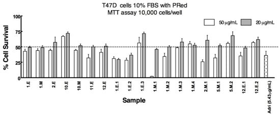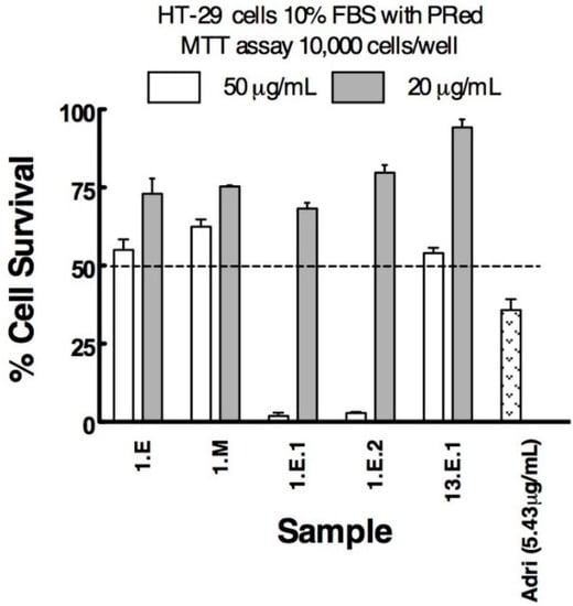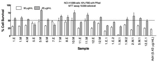 Cell survival against NCI-H1299 lung cancer cell line of samples (beach-cast extracts and fractions) tested at two concentrations (20 µg/mL and 50 µg/mL). Adriamycin at 5.43 µg/mL was used as reference.