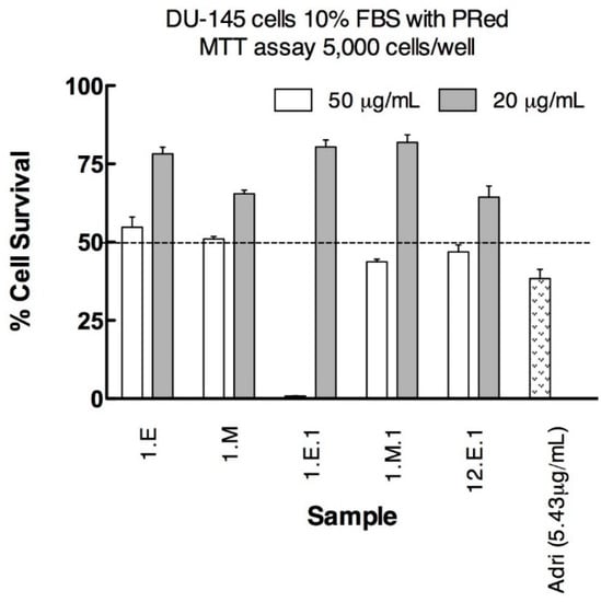 The samples were assayed against the NCI-H1299 cell line, a non-small-cell lung cancer, one of the most aggressive forms of cancers with few effective therapeutic drugs available. Twenty-one samples (fourteen extracts and seven fractions) showed interesting results (Figure 1), namely some samples which displayed cell survival values of 27–31%.