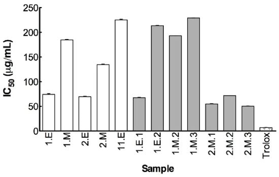 The extracts were assayed by the method described by Ndlovu et al. [31] with some modifications. Briefly, 25 µL of elastase enzyme solution (0.3 U/mL), 50 µL of ten serial concentrations of the extracts or fractions (0.488 µg/mL to 250 µg/mL dissolved in 100 mM HEPES buffer, pH 7.5 containing no more than 2.5% DMSO) and 125 µL HEPES buffer were mixed in a 96-well plate and incubated at room temperature for 20 min. Then, 50 µL of N-Methoxysuccinyl-Ala-Ala-Pro-Val-p-nitroanilide (1 mM) were added. The enzyme activity was measured at 405 nm in the moment of substrate addition and after 40 min of incubation at 25 °C in a Bio Rad Model 680 Microplate Reader (Bio-Rad Laboratories, Inc., Hercules, CA, USA). N-Methoxysuccinyl-Ala-Ala-Pro-chloromethyl ketone at 0.019–20 µg/mL (0.039–40 µM)) was used as positive control. The experiments were done in triplicate. For each concentration, enzyme activity was calculated as a percentage of the velocities compared to that of the assay, using buffer without any inhibitor. The IC50 value, which was the concentration of the sample that inhibited 50% of the enzyme activity, was determined interpolation from the % elastase inhibition vs. concentration curve.