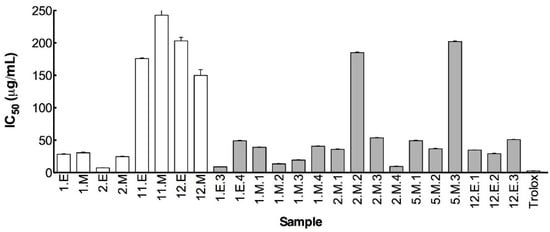 Some of the most active extracts were submitted to fractionation, which was conducted according to the following methodology. One gram of extract (methanol or ethanol) was initially mixed with 50 mL of hexane. Suspension was vortexed and sonicated in the ultrasound bath for 10 min. Afterwards, samples were centrifuged at 7200× g, at 20 °C for 10 min. The supernatant was transferred and concentrated on a rotary evaporator at 40 °C, being completely dried in an oven at 40 °C and then stored at −20 °C. The remaining residue from centrifugation was dried in an oven at 40 °C and then mixed with dichloromethane (50 mL), following the same procedure described above. Two other solvents were sequentially used, following the same procedure, namely chloroform and methanol: water (1:1, v/v). Fractionated seaweed extracts were further analyzed for their bioactivities. The fractions yields are presented in Table S2 (Supplementary Material).
