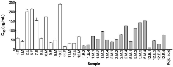 - Neeley, E.; Fritch, G.; Fuller, A.; Wolfe, J.; Wright, J.; Flurkey, W. Variations in IC50 values with purity of mushroom tyrosinase. Int. J. Mol. Sci. 2009, 10, 3811–3823. [Google Scholar] [CrossRef]