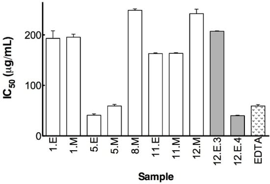 All assays were carried out in triplicate and results expressed as IC50, i.e., value which was the concentration of the sample that chelated 50% of the ferrous iron, calculated by interpolation from the % chelating effect vs. concentration curve.