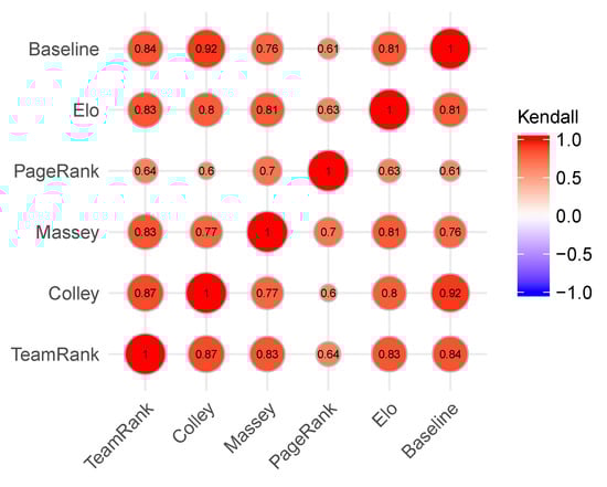 The problem of ignoring the marginal effect of a single game also exists in the models of Colley and Massey, which makes them unable to measure the impact of the opponent’s strength following a specific game. Like the TeamRank model, the Elo method considers the influence of the opponent’s strength on the team rating. However, the Elo method only focuses on the points, and the update following one game is non-recursive, which makes it impossible to modify the impacts of previous games. Although the predictive ability of Colley, Massey, and Elo is not as good as the TeamRank model, the high correlations with the results of the baseline model show that the three models are hindsight models, which indicates that they have good backtesting ability.