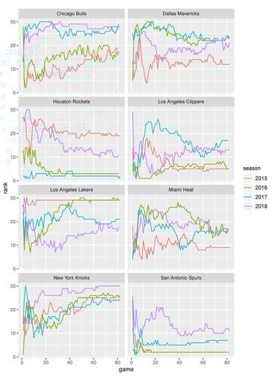 In addition to the prediction of the half-season, the game graph can be updated according to the progress of the games, thereby updating the team’s rating vector to achieve a dynamic ranking. We present the dynamic ranking results updated every 300 games in the 2018–2019 season in Figure 3. Figure 4 presents the change of rank in four seasons from 2015 to 2018 for eight NBA teams. It can be seen that some teams, such as San Antonio Spurs, have maintained a stable strength for four seasons. On the contrary, some teams have large fluctuations in their rankings during one season, such as Miami Heat and Los Angeles Clippers.