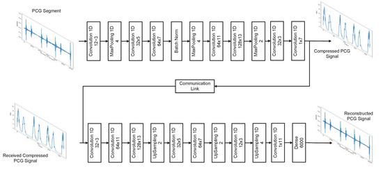 Figure 1 depicts the system model in this work. With the aid of medical professionals, such as nurses, the patients who live in rural areas can regularly collect their PCG signals using electronic stethoscopes; then, an encoder continuously compresses the PCG signals before transmitting these compressed data to the remote site via a noisy communication link. Doctors use a decoder to continuously decompress the received compressed PCG signals at the remote site, so that doctors can virtually auscultate the patients’ heart sounds without meeting with patients. Inspired by the pioneering works about the design of the deep neural network [39,40], we combine one to two convolutional networks with one max-pooling layer as a basic unit to build our proposed network architecture at the encoder side; on the decoder side, we combine one to two convolutional networks with one upsampling layer as a basic unit. Empirically, we keep stacking the basic units until overfitting happened in order to determine the depth of our network model. The details about the encoder and decoder are listed Table 1 and Table 2, respectively.