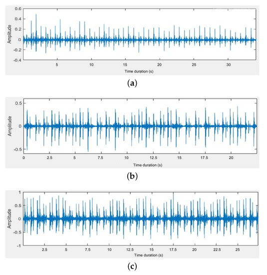 We used an open accessed dataset, which comprises nine heart sound databases that were collected by various organizations, provided by PHYSIONET [42]. Due to a large number of tested subjects and long recording time, we choose the database that was collected by the Dalian University of Technology heart sounds database (DLUTHSDB) from these nine sound databases as our experimental dataset. In this dataset, subjects included 174 healthy volunteers and 335 patients with coronary artery disease. PHYSIONET resamples the original waveform at 2 kHz. Figure 2 illustrates three recorded heart sound in the DLUTHSDB database.