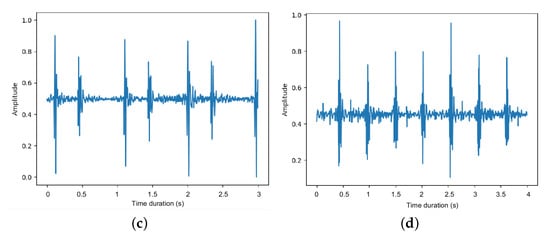 Time domain traces for various time durations: (a) 1 s, (b) 1.5 s, (c) 3 s, and (d) 4 s. The corresponding lengths of segment are (a) 2000, (b) 3000, (c) 6000, and (d) 8000 samples.