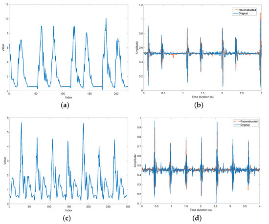 Compressed signals ((a) for the time duration of 3 s (segment length of 6000) and (c) for the time duration of 4 s (segment length of 8000)) and comparisons between original data with the reconstructed signal ((b) for the time duration of 3 s (segment length of 6000) and (d) for the time duration of 4 s (segment length of 8000)). Zoom-in plots during 0.2 to 0.6 s for (b,d) are illustrated in (e,f), respectively.