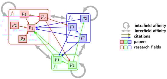 Academic publications are increasingly cited crossing the border of various disciplines, which implies that research becomes more interdisciplinary and collaborative between scholars from different scientific fields [,,]. Accordingly, Figure 1 illustrates the concept of underlying interdisciplinary citations across diverse fields of sciences. As the figure shows, an individual paper is cited by publications from its own and/or distinct fields, which is affected by time-evolving intrafield attention as well as interfield affinity.