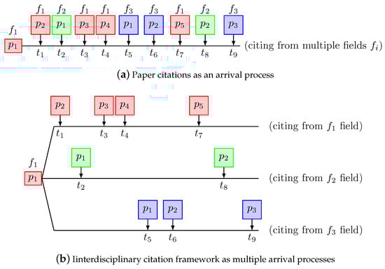 In this respect, a new framework has been proposed to model popularity dynamics by incorporating heterogeneous nature of a social system consisting of subgroups interacting one another (i.e., intra- and interfield interactions) and view the paper citations as the superposition of multiple Poisson processes for different citing fields []. As shown in Figure 2b, the paper citations are now decomposed into different timelines depending on the research fields of citing papers, and each timeline is modeled as an independent Poisson process. Since the superposition of Poisson processes is still a Poisson process [], the new framework extends the prior work [] from a homogeneous citation process to cross-field popularity dynamics.