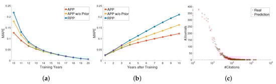 Experimental results with real data. Comparisons of prediction errors in MAPE between the Affinity Poisson Process (APP) and two baseline models (APP without a prior and RPP (Reinforcement Poisson Process)) (a) by increasing the length of training years and (b) by varying the test years based on 10 year citation histories. (c) The distributions of real (black) and predicted (red) number of citations of individual journals with the APP.