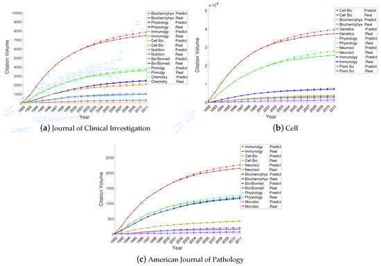 Example results from predicting interdisciplinary citation volumes of individual journals with the APP. In each plot, predicted citation volumes are separated by citing NRC subfields. Each cited journal’s NRC subfield is respectively (a) Biochem/Biophysics & Structural Biology, (b) Cell & Developmental Biology, and (c) Immunology & Infectious Disease. Prediction tests are conducted for next 10 years (2002–2011) after training the model using the first 10 year citation histories (1992–2001) since each journal’s publication year (1992).