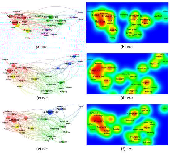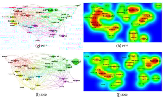 These generated networks are also presented with density maps in the second column in Figure 6, where a node with higher interdisciplinarity and density is closer to red. As shown in the figure, dense areas are changing over time, such as genetics and biochemistry/biophysics in 1991, physics and applied mathematics in 1993, computer sciences and animal sciences in 1995, cell & developmental biology in 1997, and nanoscience in 2000.