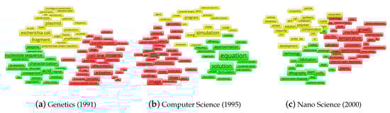 Accordingly, Figure 7 presents the keyword distributions of the highly interdisciplinary subfields from the density maps in 1991, 1995, and 2000. Keywords are extracted from titles and abstracts of journal articles published in the corresponding year, which are collected from the Web of Science [] by querying highly cited journal names of a same publication year within each subfield. In addition, keywords are color-coded by co-occurrence based clusters. Overall, about 13% of keywords are commonly used in a citing subfield with high affinity, while less than 5% of keywords are common between subfields with low or no affinities. That is, our estimated affinity between two subfields well reflects a close relation in their research. In more detail, Table A1 shows example keywords which are commonly used between the subfields in Figure 7 and the top three subfields with the highest affinities for each selected subfield. The keywords of citing subfields in Table A1 are one of the top mostly used 300 keywords, which are collected from individual papers’ keyword records in the Web of Science data.