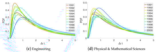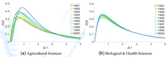 The Web of Science data (WoS) [] is investigated during the last two decades between 1991 and 2011, since publication data consistent for all target fields is only available during this period. The data contains publication records from a wide range of academic areas, each of which consists of paper profile (e.g., title, keywords, publication year, venue, and associated subjects) and citation relationships (e.g., cited and citing articles). This study focuses on STEM field publications covering 108 subjects, where some disciplines such as Biology and Engineering are more fine-grained. For the less biased and macro-level observations of interdisciplinary citation flows in sciences, these 108 subjects are grouped into higher-level research areas, i.e., 37 subfields and 4 fields, by referring to the classifications of academic programs, conducted by the National Research Council (NRC) []. The four NRC fields are Agricultural Sciences, Biological & Health Sciences, Engineering, and Physical & Mathematical Sciences, and the detailed correspondence between the WoS and NRC classifications is presented in Table A2, Table A3 and Table A4 in Appendix F.
