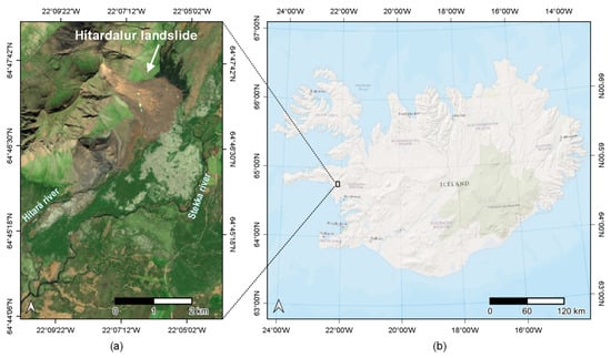 (a) The study area around the Hítardalur landslide shown on a Sentinel-2 image acquired on 17 July 2018 and (b) its location in western Iceland; background data © ESRI.