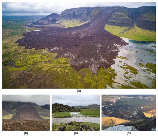On the morning of the 7 July 2018, a large landslide blocked the Hítará river and led to the creation of a landslide-dammed lake. Water from the landslide-dammed lake found a new way through the highly porous lava field. The landslide originated in an area of the Fagraskógarfjall mountain that shows evidence of earlier displacements []. The year 2018 had more rainfall than usual in Iceland [], likely leading to a higher water pressure in cracks and fractures that further weakened the rocks, and thus contributed to landslide initiation []. Helgason et al. [] estimated that approximately 7 million m3 of material was released and that a total of 10–20 million m3 of material was displaced. The landslide deposition covers an area of approximately 1.5 km2 on the valley floor and is up to 30 m thick. The fall height was about 450 m over a runout length of approximately 2.3 km at a runout angle of approximately 12°. The length of the riverbed covered with debris was estimated to be around 1.6 km. The Hítardalur landslide is considered to be one of the largest landslides in Iceland in recorded history []. Figure 2 shows field photographs of the Hítardalur landslide, the landslide-dammed lake and the river finding a new path after emerging from the dammed lake.