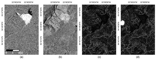 Examples of the layers extracted from the Sentinel-1 and Sentinel-2 datasets. (a) and (b) show the subtraction layers using pre- and post-event Sentinel-1 VV polarization intensity images for 2018 and 2019, respectively. The Hítardalur landslide and the landslide-dammed lake are distinguishable. (c) and (d) show the edge extraction layers derived from the post-event Sentinel-2 images (Near-infrared (NIR) band (B8)) for 2018 and 2019, respectively.