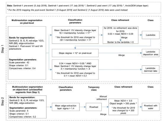 The OBIA classification of the landslide was based on the pre- and post-event VV polarization subtraction layer, the brightness layer was used for the classification of the landslide-dammed lake, and the riverbed with water was classified using the edge extraction layer and refined based on spectral and spatial parameters. The first step in the object-based mapping was the creation of image objects using the multiresolution segmentation algorithm. Then, we created a knowledge-based classification ruleset which includes thresholds based on the backscatter information from Sentinel-1 and the spectral information from the Sentinel-2 images for each year. The size of the segmentation-derived image segments is controlled by the scale parameter (SP), which is directly related to the local variations of the bands used in the multiresolution segmentation algorithm [,]. In general, the higher the value of the SP, the larger the resulting segments, and vice versa. First, multiresolution segmentation was applied at the pixel level to create suitable objects for the subsequent classification of the landslide, using the Sentinel-1 VV intensity change layer, and the landslide-dammed lake, using the Sentinel-1 VV intensity change and NDVI layers. The same features were used for classification in both years, whereby some adaptations in the thresholds for the 2019 mapping were required. The difference in the values of the Sentinel-1 VV polarization change layers between the year 2018 and 2019 could be related to the different time of the Sentinel-1 image acquisitions, and potential changes in the surface structure of the landslide, as well as different dielectric properties (e.g., moisture content) of the landslide. Another multiresolution segmentation was performed based on the unclassified segments from the first segmentation and using only the Sentinel-2 post-event images to create suitable objects for the classification of the riverbeds with water. We excluded the Sentinel-1 datasets from this classification since riverbeds were barely visible in the datasets.