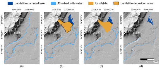 Object-based geomorphological feature mapping using Sentinel-1 and Sentinel-2 datasets. (a) shows the riverbed with water before the Hítardalur landslide using the pre-event Sentinel-2 image only; (b) shows the landslide, the landslide deposition area, the landslide-dammed lake, and the (now partly interrupted) riverbeds with water after the landslide event in 2018; (c) shows the landslide, the landslide-dammed lake, and the riverbeds with water in 2019; (d) shows the reference map from National Land Survey of Iceland IS 50V 24 September 2019 Vatnafar Flakar (© NLSI) []. The hillshade derived from the ArcticDEM was used as a background layer.