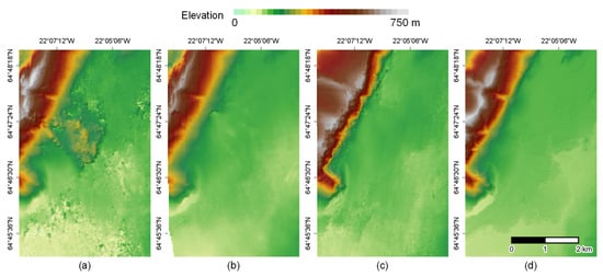Figure 6d shows the reference map from the National Land Survey of Iceland (NLSI) vector layer, available online at https://www.lmi.is (accessed on 15 May 2020); © NLSI (license: https://www.lmi.is/en/licence-for-national-land-survey-of-iceland-free-data (accessed on 15 May 2020)).
