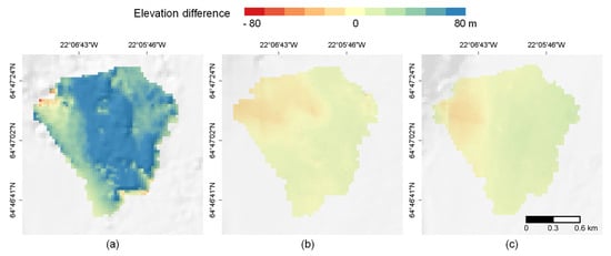 Elevation differences of the three Sentinel-1 DEMs compared to the ArcticDEM for the landslide deposition area used for calculation of the landslide volume. (a) elevation differences of DEM from track 16 (11 July 2018 and 17 July 2018); (b) elevation differences of DEM from track 118 (5 August 2018 and 11 August 2018); (c) elevation differences of DEM from track 155 (4 July 2019 and 10 July 2019). The respective hillshade derived from the Sentinel-1 DEMs was overlaid for each result.