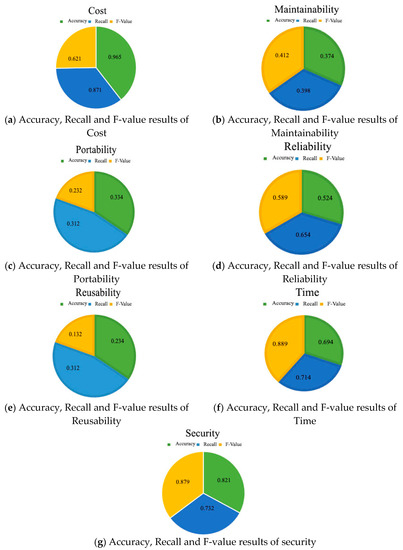 The formulas for the Accuracy, Recall and F-value have been applied to cost, maintainability, portability, reliability, reusability, time and security. Figure 5 shows pie graphs, with the yellow color representing F-value, green for the Accuracy and blue for Recall.