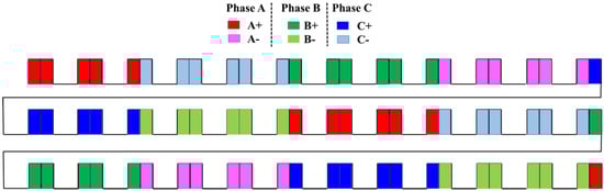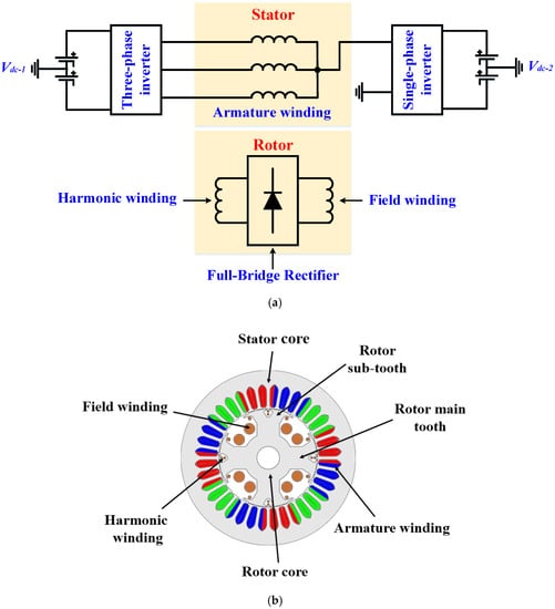 The proposed topology as presented in Figure 1a consists of three-phase and single-phase inverters. These inverters are connected to the armature winding and operate simultaneously; however, the currents they supply have different frequencies, i.e., 60-Hz and 180-Hz, respectively. The three-phase inverter is connected to the armature winding and supplies current at the frequency of 60-Hz, whereas the single-phase inverter is connected to the star-connected armature winding’s common point and injects the current at 180-Hz frequency. The main reason behind operating two inverters at two different frequencies is to develop a unique shape for the armature currents. This shape of the armature currents comprises of the fundamental as well as the third harmonic current component that results in fundamental and third harmonic MMF in the airgap of the machine. The third harmonic MMF is employed to generate current in the harmonic winding of the rotor. The harmonic winding in this case has eight poles. However, the generated current in the harmonic winding has six times the frequency of the fundamental armature current and two times the frequency of the third harmonic current component. The generated harmonic current is rectified to deliver DC current to the rotor field winding. This current produces the main rotor field which interacts with the armature field generated by the equal number of armature poles, producing torque. To confirm the operation of the proposed topology a 4-pole, 36-slot machine was employed. This machine model is presented in Figure 1b. The employed 36-slot double-layered armature winding, and the rotor harmonic and field windings configuration, is explained in Figure 2 [13,14].