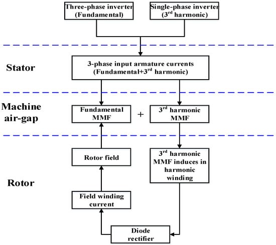 This paper suggests a new harmonic field excitation technique for the brushless operation of WFSMs which involves customary three-phase and single-phase inverters. The three-phase inverter is connected to the armature and injects three-phase currents to the armature winding. The single-phase inverter is connected to the armature star-connected common point. The inverters operate at different frequencies and supply input armature currents to generate a unique armature current shape. The composite output of the inverter’s currents for the armature winding contains the fundamental as well as the third harmonic. The fundamental is utilized to develop the stator field, whereas the third harmonic component is employed for developing the pulsating MMF in the airgap. This MMF generates a harmonic current in the harmonic winding of the rotor that is later rectified using a full-bridge diode rectifier to provide DC current to the field winding of the rotor to develop the rotor field. The generated rotor field as it interacts with the stator field develops torque.