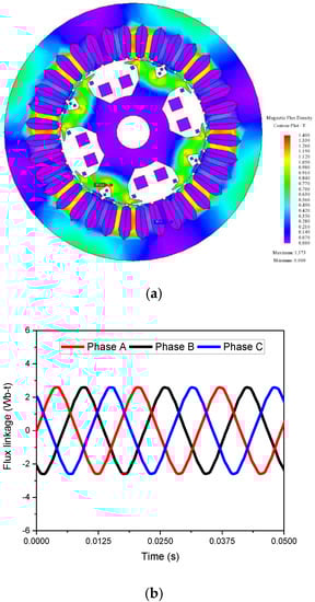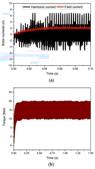 To validate the proposed brushless filed excitation technique for WFSM, the finite element method (FEM) was used. The parameters of the machine are listed in Table 1. The structure of the machine was implemented as discussed in [7]. The armature winding was supplied with a three-phase input current of 10 A (peak) at 60-Hz, and single-phase input current of 10 A (peak) at 180-Hz. As the input armature current comprised of the fundamental and third harmonic, the fundamental component generated the main armature field; however, the third harmonic current component generated 12-pole harmonic current in the harmonic winding of the rotor. This harmonic current was rectified to inject the excitation current to the rotor filed. The simulations were performed for 1.5 s using JMAG-Designer 18.1. The magnetic field density plot achieved during these simulations along with the three-phase flux linkages are presented in Figure 6a,b, respectively. The magnetic field density plot shows that the machine was operating under the saturation level. The induced harmonic current along with the rectified field current is demonstrated in Figure 7a. Figure 7b illustrates the output torque of the machine. The average torque achieved during the complete simulation time was around 14.372 Nm with a torque ripple of 66% as shown in Table 2.