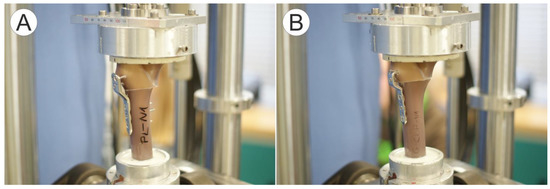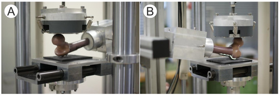 Test setup for axial torsion on the material test machine with mounted synthetic femora specimen: (A) F-PL with PediLoc Locking Proximal Femur Plate and (B) G-CBP with PediLoc Locking Cannulated Blade Plate System.