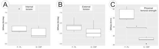 In this biomechanical comparative study, we investigated the torsional stiffness for internal and external rotations and the proximal strength of the osteotomized synthetic femora for two implant systems (PL and CBP). The average torsional stiffness of the F-PL group was higher than that for the G-CBP group. Differences in internal and external rotations were found between the two both groups. However, this difference was not significant (Figure 3A,B). Moreover, the F-PL system has proximal locking screws to ensure that bending moments were further reduced during loading.
