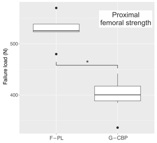 The mean stiffness of the F-PL group was 53.9 ± 6.4 N/mm and that of the G-CBP group was 26.1 ± 2.7 N/mm (Figure 3C). This difference was also significant (p = 0.018). The mean force for the F-PL group and G-CBP group where implant failure occurred was 554 ± 71 N and 399 ± 33 N, respectively (Figure 4). This difference was significant (p = 0.003).