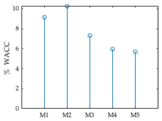 Figure 2 provides an over-the-years and companies-wide outlook of the implicit effective WACC by forecasting strategies. WACC values over 70% were considered outliers and they are removed from the samples. Panels (d) and (e), corresponding to methods M4 and M5, respectively, show more restricted dynamic behavior for WACCs, exhibiting as a consequence much lower variability, which is consistent with previous visual inspections and with the statistical results shown in Table 4. As a summary, we can argue that although variability, expressed as the Standard Deviation (STD), was high in all methods accounting for over 50% of mean or median, models M4 and M5 significantly outperformed the others. It is relevant to mention that M1 presented the poorest results in terms of stability. An empirical analysis of the previously mentioned companies (Inditex, 3MCo, and Coca-Cola) for 12 years in a row (see in Table 5) showed a very stable Year-on-Year (YoY) behavior for the M4 model. This result can be recognized as a positive contribution, as it validates the aforementioned forecasting strategies to be considered as a valid feature to be incorporated in subsequent valuation models.