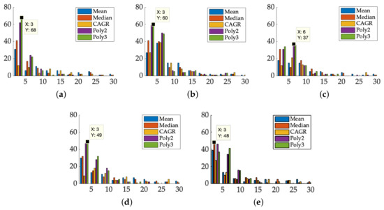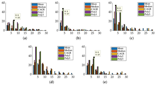 Table 10 shows the estimated figures of merit (MSE, MAE, and RMSE) for EV accuracy in linear regression for the implemented methods described earlier. Statistical error figures supported the visual inspection findings, offering better results for the model that incorporates the endogenous and exogenous variables simultaneously. In particular, lower error was obtained when considering both sets of variables, showing a RMSE of 6.51.