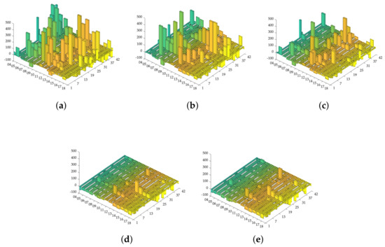 Errors for several years (x axis) and companies (y axis) obtained when considering the reference WACC in the EV models: (a) M1, (b) M2, (c) M3, (d) M4, (e) M5.