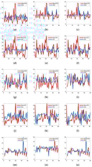 Figure 7 and Table 12 show the results and the statistical analysis, respectively, for EV estimation by sector. Utilities sector was confirmed to be the most accurately followed by the deployed model, with an RMSE of 1.1746 being the smallest one. This fact was visually verified in Panels (m,n,o). In these specific companies, the estimated EV (in blue) and real EV (in red) drew closer to each other than other represented sectors, and it was especially remarkable when endogenous and exogenous variables were simultaneously used, see Panel (o).