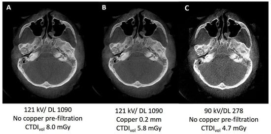 - Lell, M.M.; May, M.S.; Brand, M.; Eller, A.; Buder, T.; Hofmann, E.; Uder, M.; Wuest, W. Imaging the Parasinus Region with a Third-Generation Dual-Source CT and the Effect of Tin Filtration on Image Quality and Radiation Dose. Am. J. Neuroradiol. 2015, 36, 1225–1230. [Google Scholar] [CrossRef] [PubMed]
