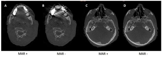 All four cadaver heads had dental implants. The metal artifact reduction algorithm was beneficial in all examined data sets (Figure 2) (mean Likert scale value 2 with MAR vs. 1 without MAR). Less beam hardening artifacts were visible due to MAR, the cortex of the mandible and maxilla and the bony structures were better visible (Figure 2A,B). MAR did not miscalculate or disturb the datasets (Figure 2C). Beam-hardening artifacts of metal implants were visible even in the vertebral bodies in the images without MAR, but not in images with MAR. Despite MAR, the bony fixation of the implants was not visible in some places, depending on the angle of rotation and the direction of the beam hardening artifacts (Figure 2A).