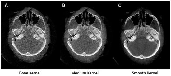 Hard kernels substantially increased image noise (Figure 3A), whereas soft kernels (smooth) led to a blurred visualisation of the bony edges yet with significantly less image noise (Figure 3C). In terms of image impression, the medium kernel (Figure 3B) delivered the best compromise between image noise and sharp bony edges.
