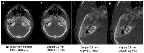 Comparison of datasets (121 kV/DL 1090) without (A) und with 0.2 mm copper (B,C), respectively 0.3 mm copper pre-filtration (D). Despite decreasing radiation exposure, pre-filtering with copper shows no deterioration in the image quality in the head overview (A,B) or in terms of the recognisability of details (C,D).